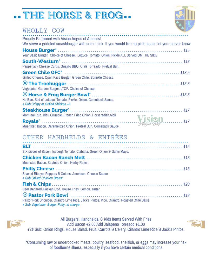 If you’re looking for a place that serves up great food in a cozy setting, The Horse And Frog Menu at 128 S Interocean Ave, Holyoke, CO, is the spot. Whether you’re in the mood for something hearty or light, there’s always something to satisfy your cravings. The menu offers a wide variety of dishes, with options ranging from comforting classics to exciting new flavors that will leave you coming back for more. Fresh, locally sourced ingredients are at the heart of each dish, making sure every bite is as flavorful as it is satisfying.